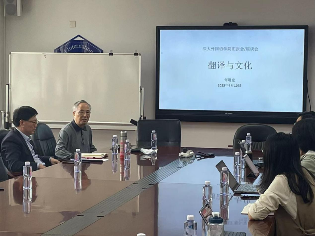 外国语学院荣休教授、资深翻译家何道宽先生以《翻译与文化》为题,向在场师生们分享了自己的翻译心得,并强调翻译一定要放在文化语境中、结合文化去翻译,翻译者也是文化的传播者。
