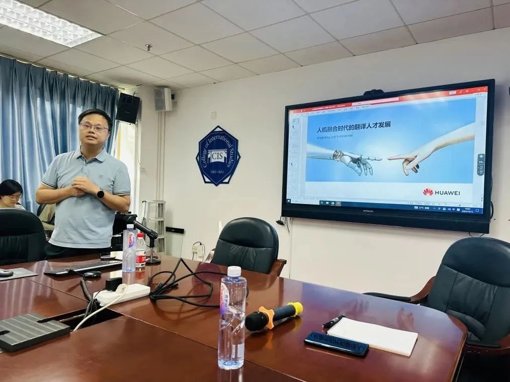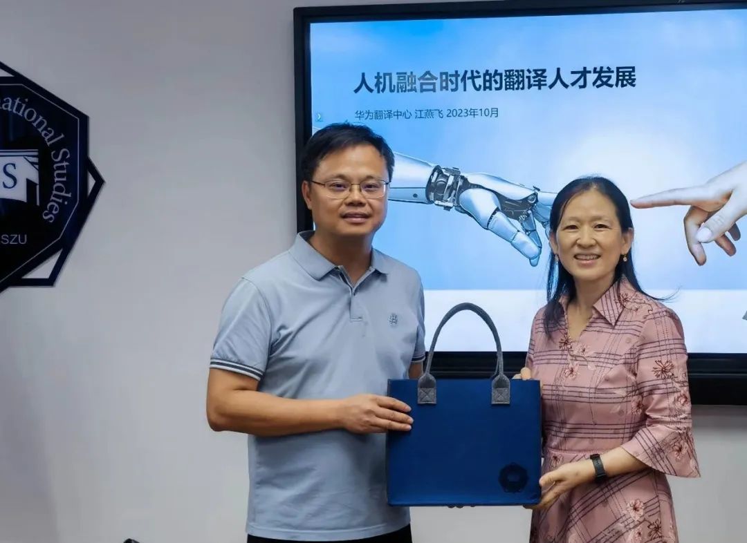 2023年10月12日,应深圳大学外国语学院邀请,华为技术有限公司翻译中心主任、深圳大学翻译专硕(MTI)校外导师江燕飞教授莅临我校,为广大师生带来了“人机融合时代的翻译人才发展”的主题讲座。江主任基于华为的翻译实践,深入探讨了人机融合时代译员面临的机遇和挑战,以及人机之间的共生关系。最后对此背景下翻译人才发展的路径提出了宝贵的建议。讲座由外国语学院尚小奇副教授主持。