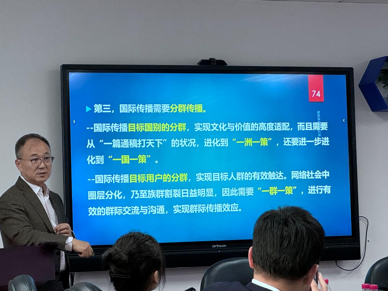 正式进入讲座前,胡教授分享了2023年全球软实力指数排名,通过统计排名可以看出中国在国际传播方面的优势,同时也存在明显的短板。由此,胡教授引出本次讲座的重要探讨问题:明明中华文明很丰厚,中国故事很丰富,为何国际传播有遗憾?胡教授主要从战略设计和体系构建两大部分进行讲述。在第一部分,胡教授通过援引习近平主席在二十大报告和中共中央政治局第三十次集体学习中的讲话,从战略高度上阐述了中国要如何加强国际传播能力。在二十大报告中,胡教授特别关注到国际传播与国家安全之间的关系,要坚持以政治安全为根本,以军事科技文化社会安全为保障,坚定维护国家政权安全、制度安全、意识形态安全。在第三十次集体学习习主席的讲话中,胡教授重点关注了加强我国国际传播能力建设的重要任务,即如何加强和改进国际传播工作,以更好展示真实立体全面的中国。第一,必须加强顶层设计和研究布局,构建具有鲜明中国特色的战略传播体系;第二,要加快构建中国话语和中国叙事体系,打造融通中外的新概念、新范畴、新表述,广泛宣介中国主张、中国智慧、中国方案;第三,要采用贴近不同区域、国家和群体受众的精准传播方式,推进中国故事和中国声音的全球化表达、区域化表达、分众化表达;第四,要深入开展各种形式的人文交流活动,通过多种途径推动我国各国的人文交流和民心相通;第五,要加强对领导干部的国际传播知识培训,发挥各级党组织作用;还要加强高校学科建设和后备人才培养,提升国际传播理论研究水平。结合所讲内容,胡教授还为师生们推荐了阅读书籍,即傅莹的《在彼处》和《看世界》,以及约瑟夫.奈的《软实力与中美竞合》。