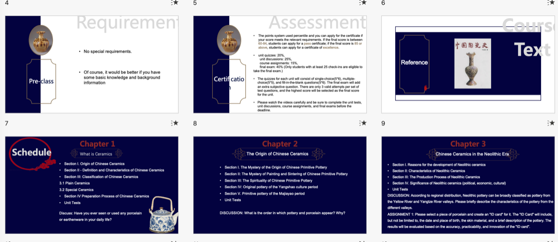 《多媒体与外语教学》课程主要包括四讲(16课时)理论课和四讲(16课时)实践课。四讲理论课分别介绍计算机技术、移动技术、增强现实技术(AR)和虚拟现实技术(VR)以及人工智能(AI)的基本概念、发展情况、优势、所面临的挑战及问题,以及在外语教学中的运用。四讲实践课结合理论,主要覆盖“在线开放外语教学课程”、“微课与外语教学”、“游戏化与外语教学”和“社交媒体与外语教学”四个主题。除此之外,每节课还会给学生传授和中国文化相关的内容,以增加“以文育人”的思想政治教育功能。除讲授外,学生以小组为单位在课后进行小组讨论,完成小组作业和反思日志。