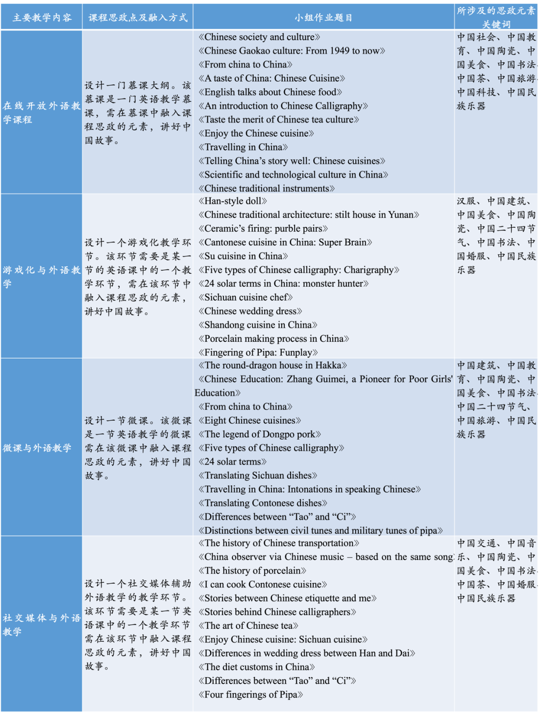 第一讲实践课要求学生设计出一门全英文慕课的教学大纲,学生在展示教学大纲时大多采用文字或文字+图片的形式;第二讲实践课要求学生设计一个全英文的游戏化教学活动,大部分小组通过图片或文字+图片进行展示,有些小组制作出了游戏demo;第三讲实践课要求学生设计一节全英文微课大纲,学生展示的形式包括文字、图片和视频;第四讲实践课要求学生设计全英文的社交媒体辅助外语教学的活动,学生选取的社交媒体平台涵盖了微信、QQ、微博、豆瓣、哔哩哔哩等主流的社交媒体,有些小组还运用了网易云音乐、HelloTalk等非社交媒体平台中的社交媒体功能,也有小组设计了社交媒体平台和有趣的教学环节,大部分小组采用文字+图片进行展示。
