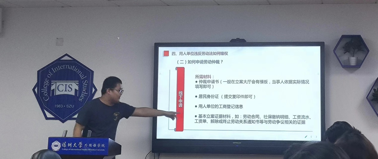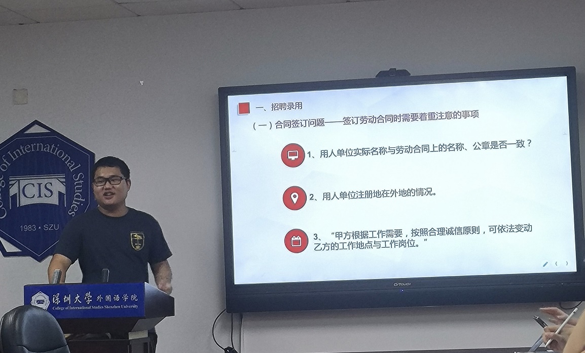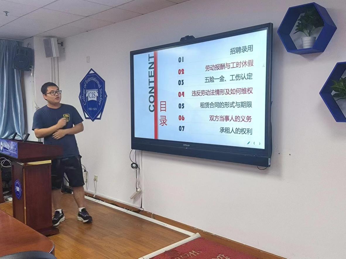 首先崔同学以亲切的开场白拉近了与在场同学间的距离,在强调劳动法重要性的同时也指出了劳动法知识的复杂性。讲座主要从招聘录用、劳动报酬与工时休假、五险一金、工伤认定、违反劳动法情形及如何维权、租赁合同的形式与期限、双方当事人的义务、承租人的权利七个方面展开。