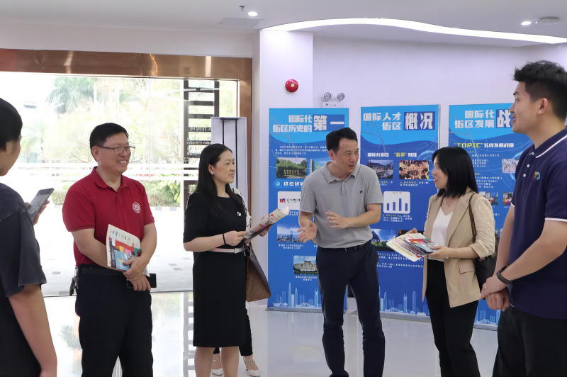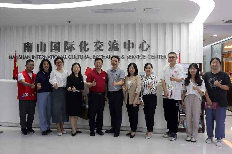 2024年4月24日下午,深圳大学外国语学院院长戴永红,党委副书记李慧敏,副院长贾陆依,辅导员老师陈文浩,学生代表杨善婷、高璀璨6人走进南山国际化交流中心,观看招商街道国际化宣传视频,就建立国际化志愿者队伍合作事宜开展座谈。