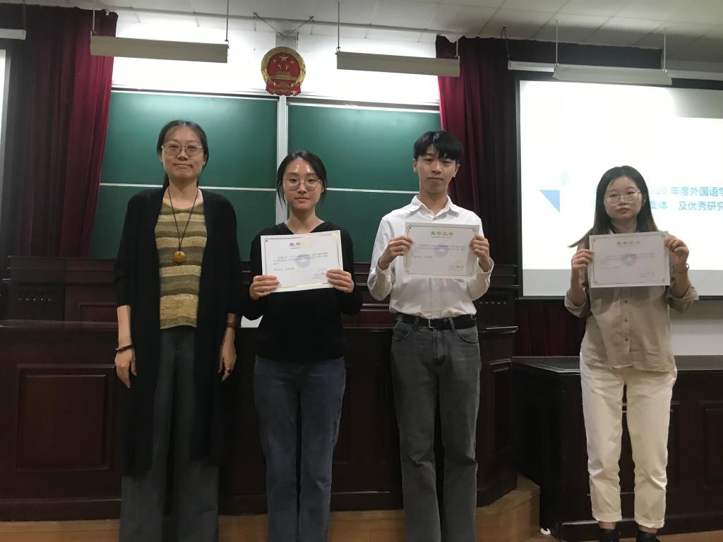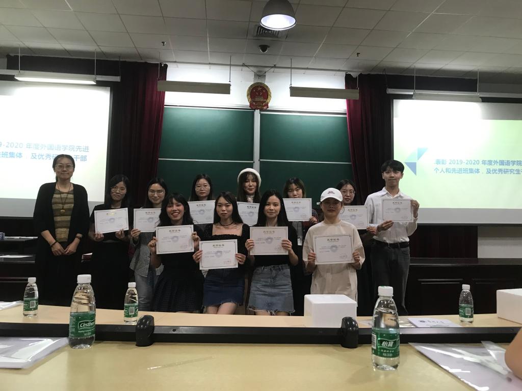 大会第四部分为表彰2019-2020年度外国语学院先进个人、先进班集体及优秀研究生干部。崔洁老师分别为他们颁发了获奖证书。包括:先进个人:刘芳、李海涛、段淑媛、韩雨秀、李春艳、肖海燕、刘慕瑶、唐国琳、辛安琪、朱琴、苏诗稀;先进班集体:19级日语语言文学班;优秀研究生干部:林燕婷、郑家嘉、陈璐、韩雨秀、李海涛。