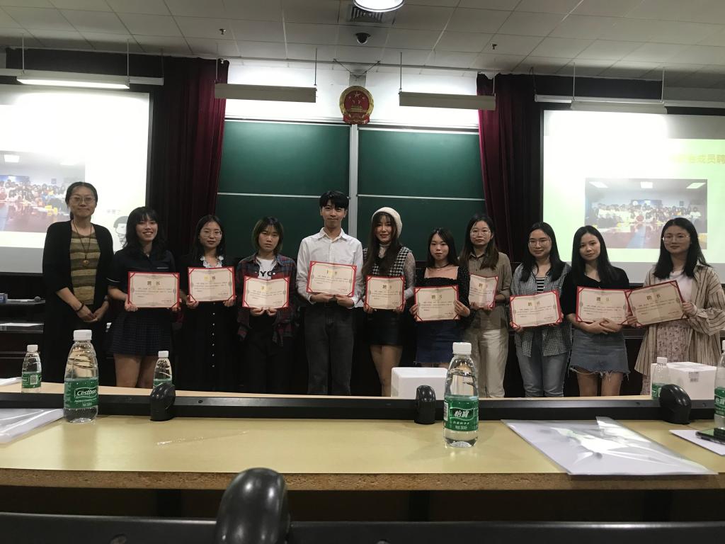 大会第三部分为为第十二届研会成员颁发聘书。崔洁老师为第十二届研会成员苏诗稀、辛安琪、李海涛、肖海燕、袁子婷、韩雨秀、刘慕瑶、李春艳、唐国琳、段淑媛颁发了聘书,并感谢他们过去一年的辛勤付出。