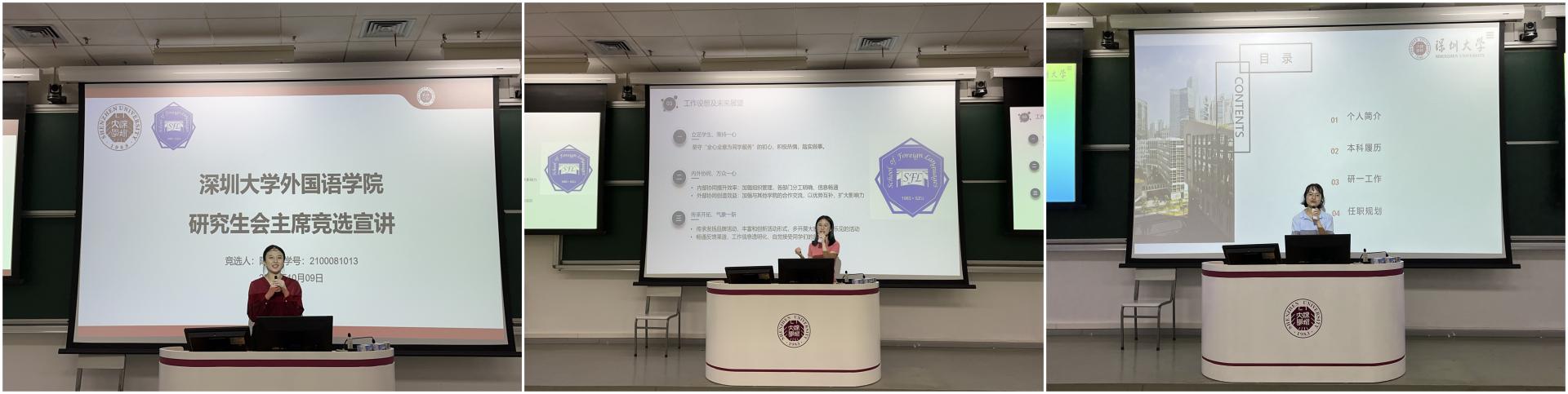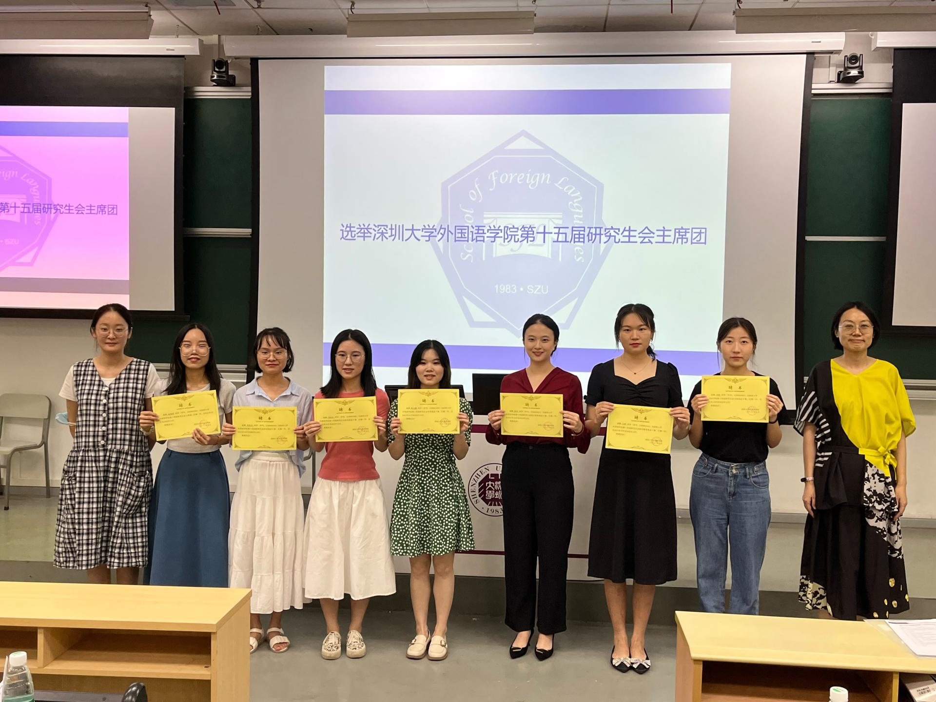 金秋十月,丹桂飘香。10月9日晚19:30,深圳大学外国语学院第十五次研究生代表大会在汇文楼H4-101顺利召开。学院研究生会指导老师崔洁、团委书记周金岁老师,各兄弟学院研会代表及外院各班级学生代表出席了本次会议。会议由第十四届研会主席赵燕萍主持。