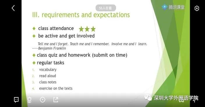 According to the feedback from some students, when there was little influence of the hardware equipment and the network fluctuation, teachers and students could use the softwares without any hindrance. Thanks to previous rehearsals, the interaction between teachers and students was well in order. But when the network was unstable, there were situations of delay during classes, for example, some students may fell behind of the normal speed due to network problems, so they heard the teacher’s question a bit later only to find out it was already answered and the class had moved on to new topics. There were some concerns before that online courses would lack efficiency, but it turned out to exceed our expectation. With teachers assigning homework and tasks for preview, the contents of the course were better organized and connected. In addition, some students reported that during peaking hours, problems like crowded platform would easily cause the situation where students missed their classes or being late. Busy servers also caused problems of logging out for no reason or simply unable to log in. But students could reach to their teachers and report the problems via WeChat groups.
