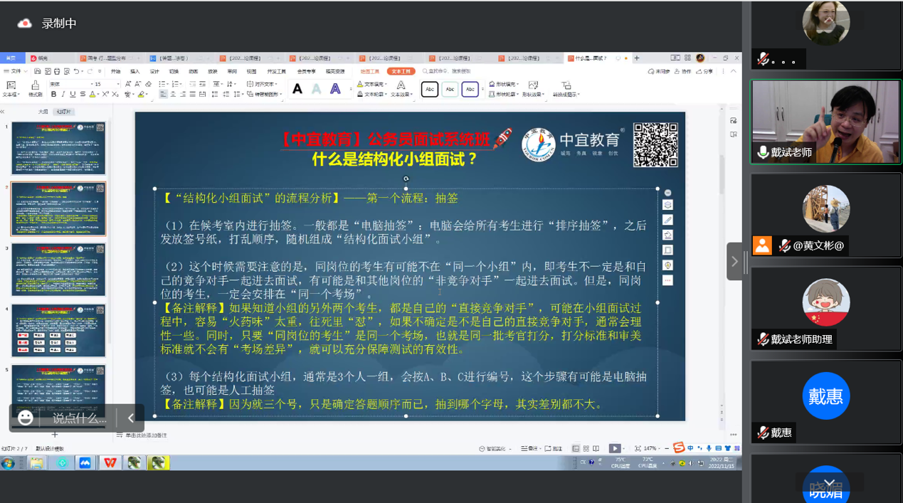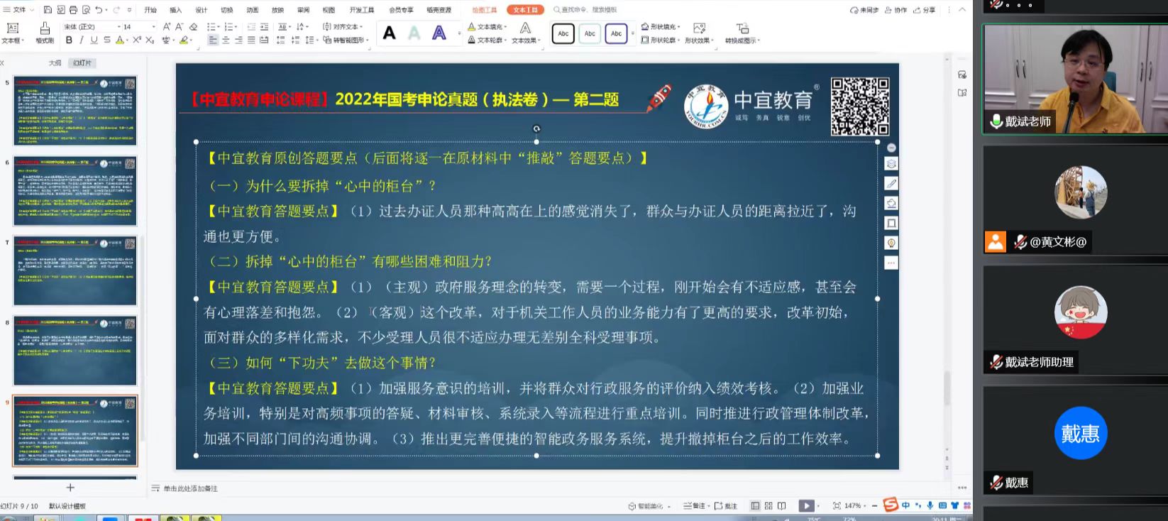 紧接着,戴斌老师就《申论》真题进行例题讲解,并对列提纲、公开信、分析题等题型的分析以及答题方法进行了重点归纳。然后,戴斌老师介绍了国考面试的创新形式—结构化小组面试,并指出这是一种十分考验考生的临场反应的面试形式。针对漫画题、组织协调题、情景模拟题这三种题型,老师具体分享了破题方法并举例分析,并做了总结——“自答时尽量滴水不漏,他答时找漏洞”。