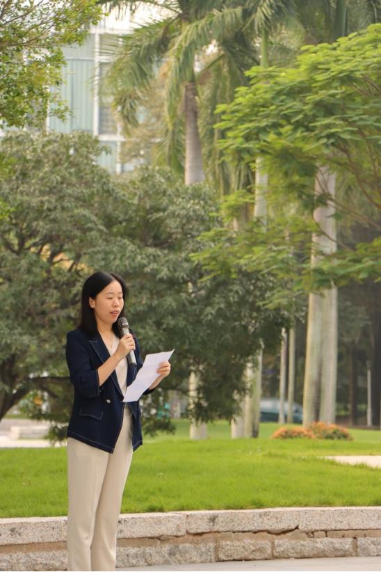 最后,主持人做总结发言,升旗仪式圆满结束。我们作为深圳大学的莘莘学子,身处特区前沿,应珍惜和平时光,当以“时代楷模”为榜样,深入学习习近平新时代中国特色大国外交思想,理解并贯彻“人类命运共同体”理念,积极响应“一带一路”倡议,传递中国声音,讲好中国故事!