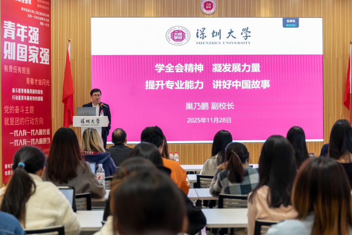 为进一步加强大学生时事政治学习、形势政策教育和思想政治教育,11月28日下午,深圳大学副校长巢乃鹏教授走进 “一站式”学生社区——时光社区106活动室,以“学全会精神、凝发展力量,提升专业能力,讲好中国故事”为题,为外国语学院学生讲授思政课,宣讲党的二十届四中全会精神。外国语学院学生、辅导员、党建组织员等50余人参加活动。学院党委书记邱江平主持活动。