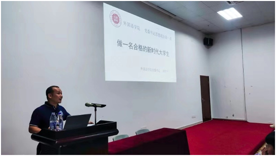 为认真贯彻落实广东省学校思想政治理论课建设推进会精神,结合“不忘初心、牢记使命”主题教育,2019年9月19日晚,深圳大学外国语学院党委书记邱江平在学生活动中心一楼影视报告厅为2019级有入党意愿的新生主讲思政第一课,主题为“做一名合格的新时代大学生”。