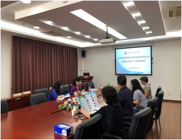 2019年10月12日,张晓红院长一行赴广东外语外贸大学英语语言文化学院开展调研与交流工作,双方就英语专业建设、外语学科发展和国际化行动等问题进行了深度交流与沟通。