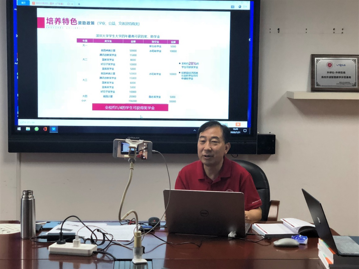 7月21日至7月22日,深圳大学外国语学院张晓红院长、贾陆依副院长、王岗主任及陈嵘主任通过线上平台开展了4场高校招生茂名专场宣讲活动,每场直播持续近一个半小时,总计六个小时。本次招宣通过视频+线上直播的方式向广大观众介绍我校的基本情况、办学特色以及最新招生政策,帮助考生和家长深入全面地了解深大。据统计,本次线上宣讲累计在线人数达51600人次,起到了良好的宣传效果。