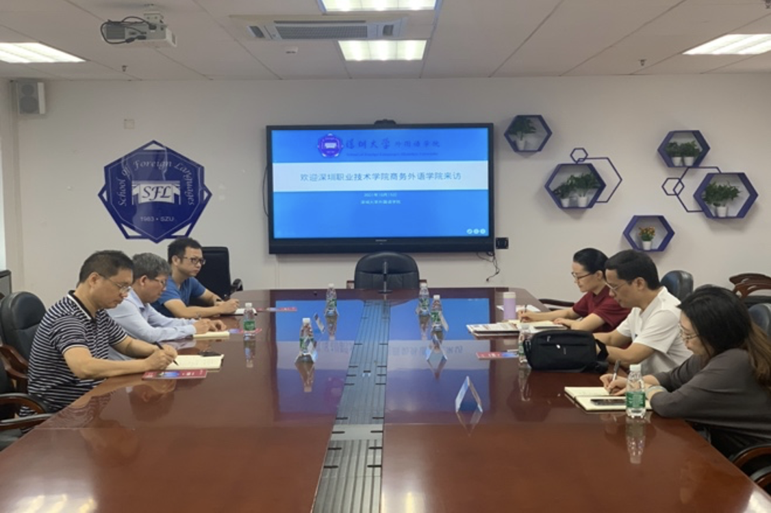 10月15日上午,深职院商务外语学院副院长刘建珠,公共外语部教研室主任汪文格和杨洋一行三人,来我院进行调研学习。我院院长助理金娜娜博士,大学英语部何勇副主任,语言实验中心区可挺副主任和教务秘书田苑老师在汇文楼行政楼1200会议室接待了刘建珠副院长一行。