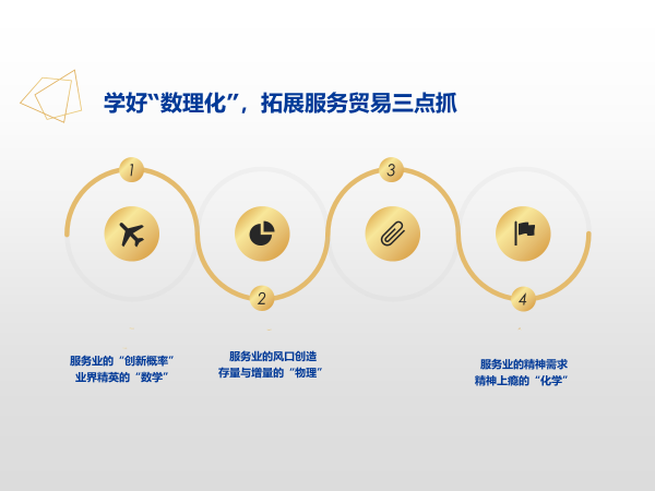 我认为深圳应学好“数理化”,拓展服务贸易三点抓。只有跑来的生意,没有等来的订单。乘风破浪会有时,直挂云帆济沧海,走出去,跑出去,跑到全球去。