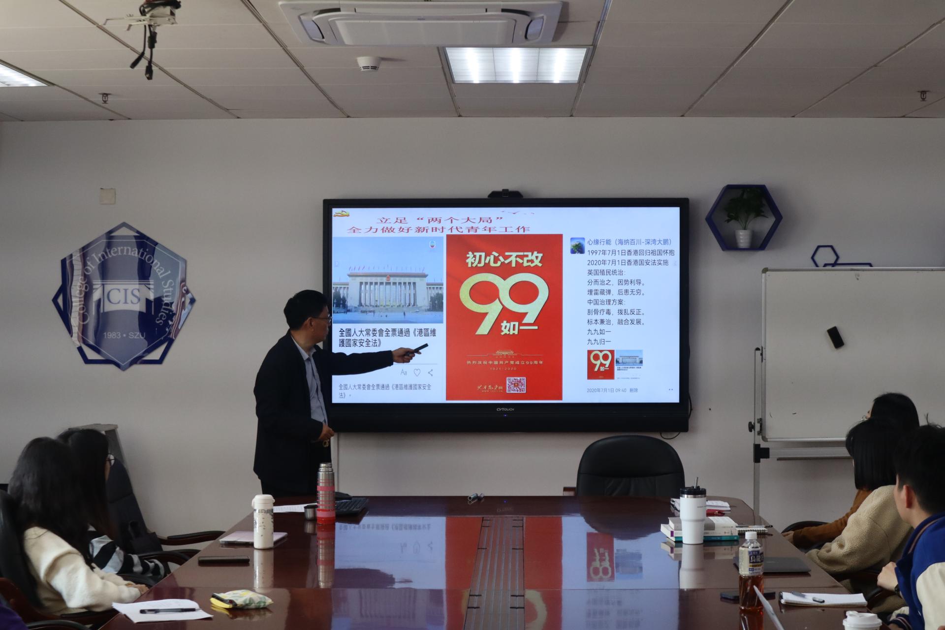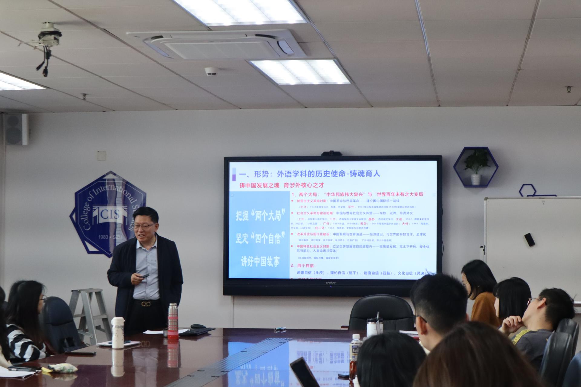 3月6日中午12时40分,深圳大学外国语学院院长思政第一课在汇文楼1200会议室举行。院长戴永红教授面向研究生和大三大四本科生以“外语学科创新转型与科研素质的培养”为题进行授课。院长就以下四个方面讲述外语学科创新转型的原因和培养科研素质的必要性——(1)形势:“两个大局”呼唤外语学科创新转型;(2)顺势:国际复合型人才培养的区位优势与政策条件;(3)借势:国际复合型人才培养赋能中国海外利益发展与安全;(4)储能:科研素质的培养。