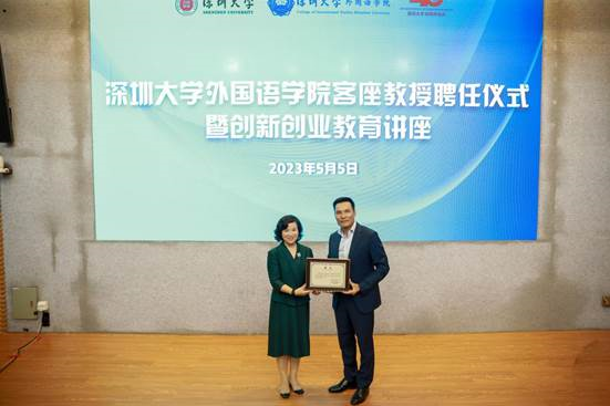 2023年5月5日,深圳大学外国语学院叶文学先生客座教授聘任仪式暨创新创业教育讲座在深圳大学汇星楼二号报告厅顺利举行。深圳大学副校长张晓红、利得来集团董事长叶文学、外国语学院副院长胡亦杰,以及利得来集团的嘉宾、外国语学院师生代表共计两百余人参加仪式。外国语学院党委书记邱江平主持聘任仪式。