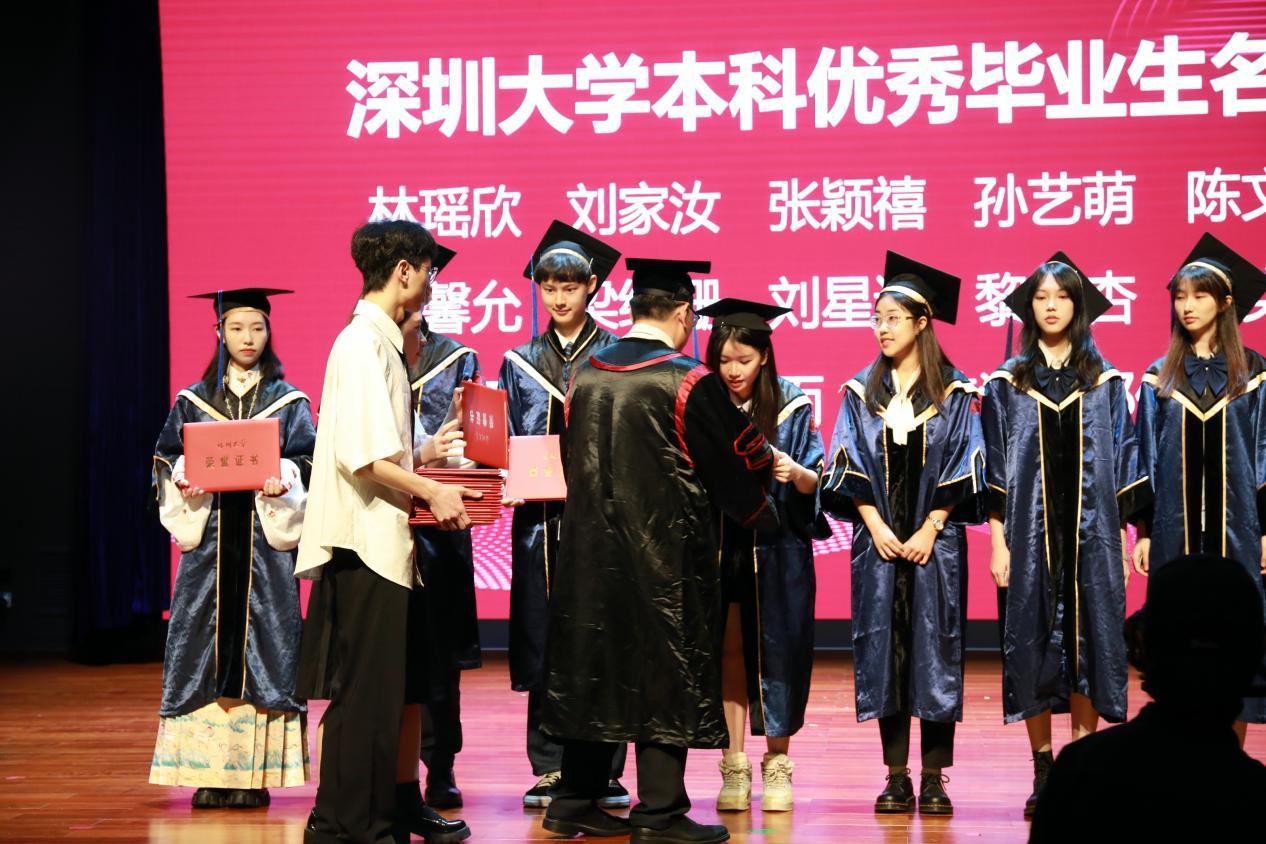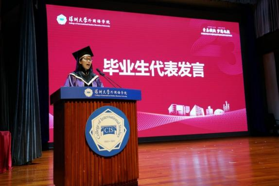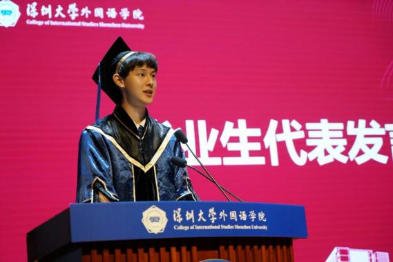 毕业研究生代表曾玉慧和毕业本科生代表彭梓洲依次发言。曾玉慧分享了在荔园求学七年的所感所得,勉励大家要“保持谦逊和勇敢、追求成长”,祝愿深大“蒸蒸日上”、学院“再创辉煌”。彭梓洲用“好奇”“爱”“梦”三个关键词提纲挈领,把大学四年的求学感悟娓娓道来。最后,他祝愿荔园学子勇敢追梦,带着对世界好奇心奋发远航。