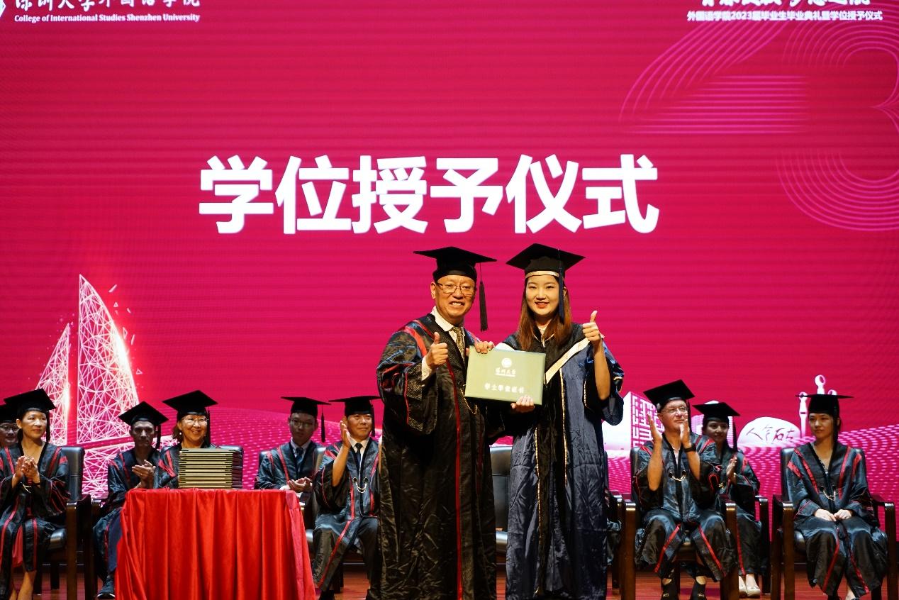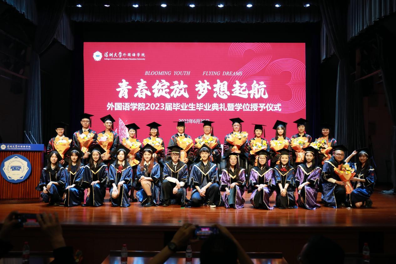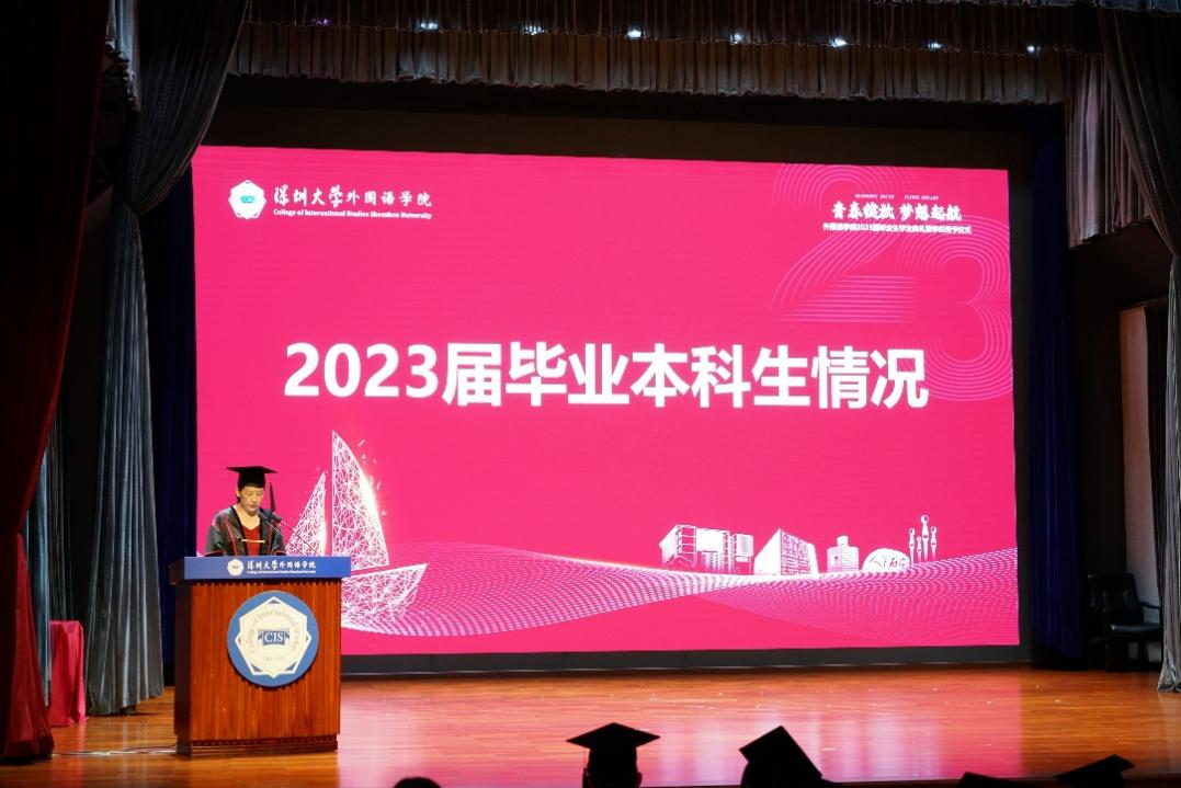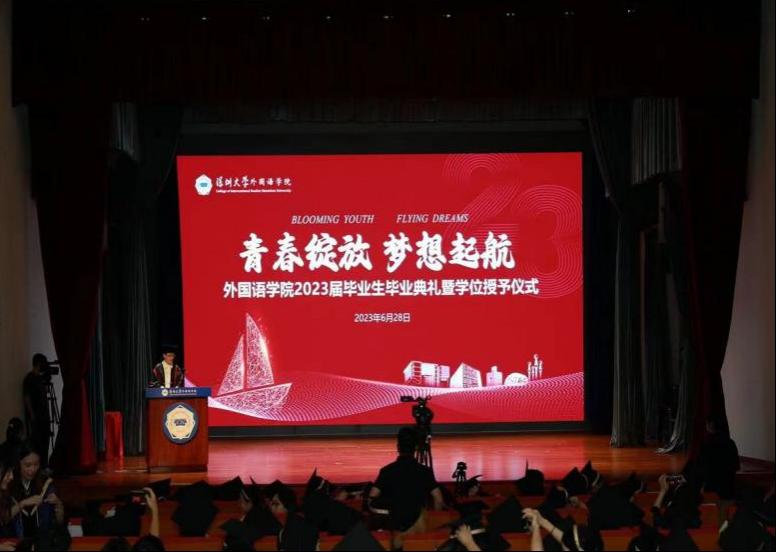 2023年6月28日上午,外国语学院在深圳大学国际会议厅大厅隆重举行2023届毕业生毕业典礼暨学位授予仪式。外国语学院戴永红院长、贾陆依副院长、金娜娜副院长、张丹阳副院长、李慧敏副书记、陆烁特聘教授、宁一中特聘教授、JEROEN特聘教授、各系部主任、教师代表、校友代表、2023届毕业生,近300人现场参加了典礼,超过2500人次线上观看了典礼直播。典礼由金娜娜副院长主持。