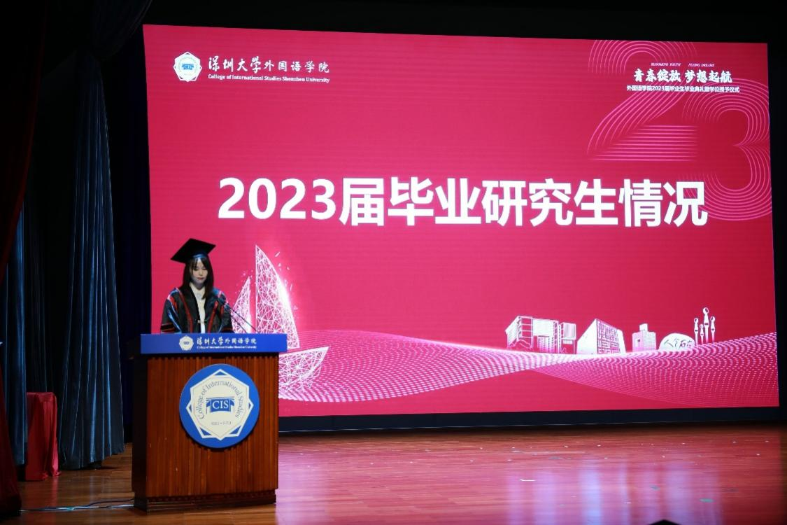 贾陆依副院长和张丹阳副院长分别介绍了2023届本科、研究生情况。外国语学院在2023年共有277名全日制本科毕业生、47名硕士毕业生,其中有69名本科毕业生被国内外高校录取为硕士研究生,包括北京大学、浙江大学、香港大学、爱丁堡大学等知名高校。2023届毕业本科生积极参与各级各类学科竞赛,共获奖 29 项,国际级1项、国家级 19项、省部级 9 项,成绩斐然。2023届毕业研究生出类拔萃,品学兼优,科研成果突出,在知名期刊发表了学术论文,获得“国家奖学金”、“腾讯创始人创新奖学金”、“深圳大学优秀学生干部”等多个奖项。