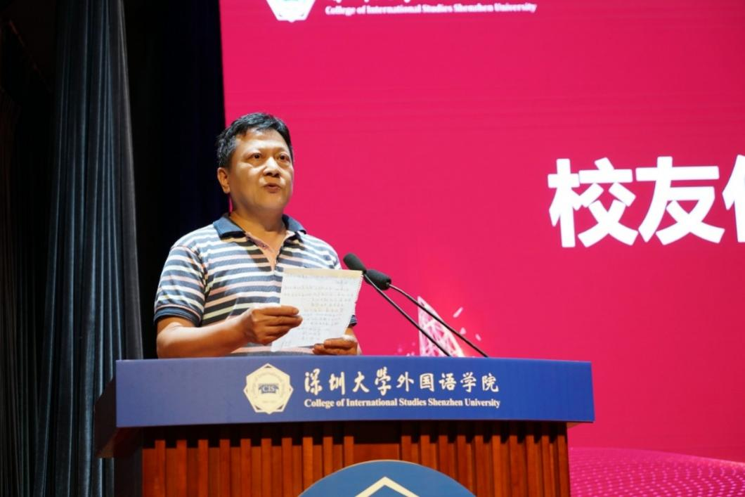 接下来,外国语学院校友会名誉会长、85英语专业汪小海校友发言,为毕业生送上祝福。他表示深大40年的光辉历程离不开老师同学生们的薪火相传,他祝福即将踏上新征程的荔园学子们“前程似锦”。