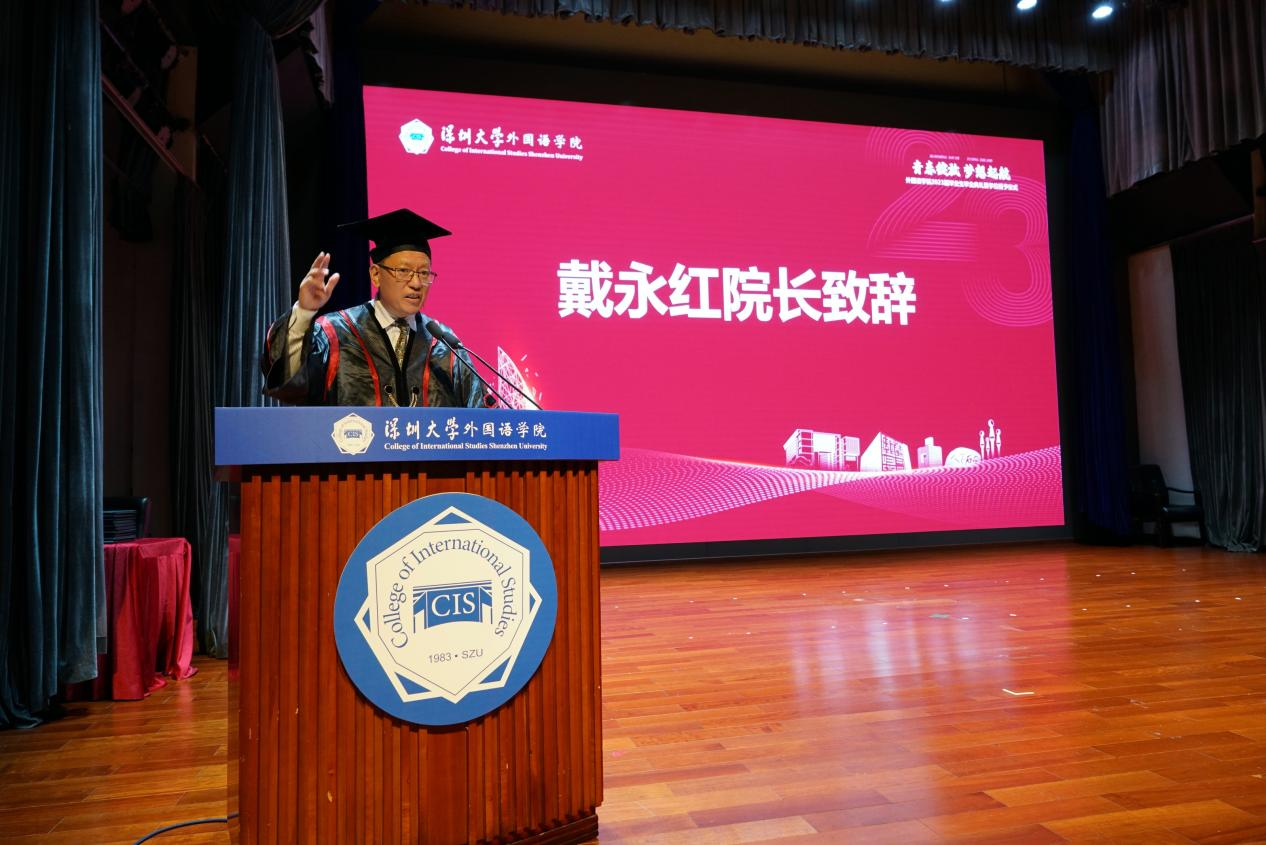 戴永红院长致辞,发表了热情洋溢的讲话。戴院长先用英语、德语、日语、西语和法语问候各语种毕业生。他祝贺同学们顺利毕业,并感谢学校和老师们的辛勤付出。戴院长表示“荔园四载,疫情三年”,让我们更加懂得了“使命”的崇高,“精神”的力量,以及“奋斗”的珍贵。他强调时代和历史赋予了外语学科“创新转型”的使命,鼓励同学们以文明互鉴、通古今之念为己任,成为国际复合型创新人才,为国家和民族的发展作出贡献。戴院长强调“精神”的重要性,有了精神,我们才能拥有“闯劲”“干劲”和“韧劲”,才能担当时代责任,成为“社会的脊梁,国家的希望”。同时他勉励同学们不懈奋斗,懂得延迟满足的幸福;要脚踏实地多积尽寸之功,随着社会发展潮流顺势而上,定能大有作为。最后,戴院长以“深湾浪涛,沙尽金见;外院筑梦,大鹏万里”结束他的演讲,祝福外院学子前程似锦、未来可期。
