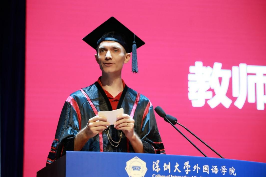 随即,教师代表Bradley发言。Bradley 首先表达了对深大的热爱以及作为教师代表上台发言的喜悦,接着分享了自己本科毕业之后因为就业问题不得已继续攻读英语硕士学位的故事。他鼓励同学们说“如果你们未来遇到生活上或者事业上的困境,当然我希望你们一路坦途,但是如果真的遇上了,我希望你们能记住我的故事,记住‘黑暗中仍有一线光明’”。