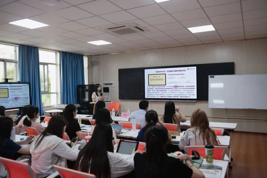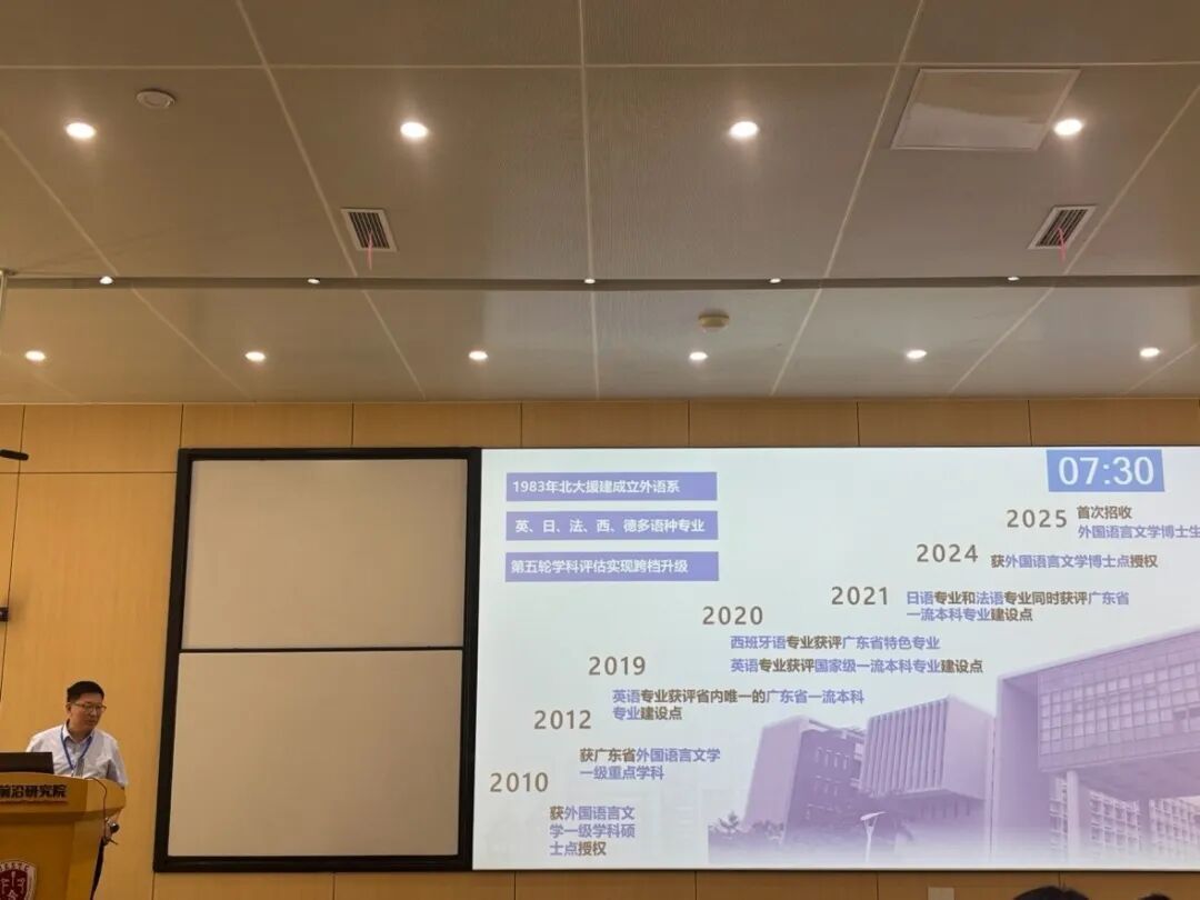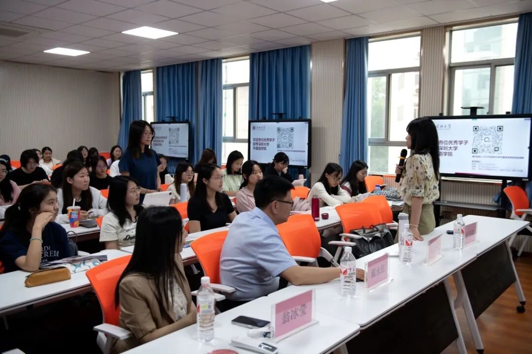 随后,张丹阳副院长从学校和学院两个层面展开详细宣讲。她指出,深圳大学发展迅速,在软科等世界大学排名中表现亮眼,综合排名位居中国内地高校前列;学校师资力量雄厚,汇聚众多国内外院士及高层次人才,科研成果丰硕,为学生提供广阔发展空间与丰富实践机会。在学院层面,张丹阳副院长介绍了外国语学院的学科建设情况,包括外国语言文学一级学科博士点、多个硕士点以及优质学科平台,同时提及学院强大的教师队伍、高质量教学指导,以及与多所境外高校开展的联合培养项目。