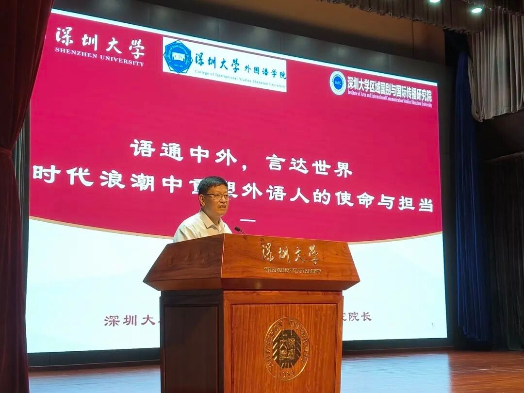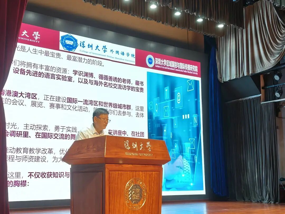 戴永红院长为典礼致辞,并以《语通中外,言达世界——时代浪潮中重塑外语人的使命与担当》为题,为全体新生讲授了意义深远的思政第一课。戴永红院长指出,当前我们正身处“世界百年未有之大变局”,外语学科迎来前所未有的创新与转型机遇。同时强调,外语不仅是沟通的工具,更是理解世界、传播中国、参与全球治理的重要载体。现在区域国别研究与国际传播已成为外语学科的新前沿,深大外院将致力于培养“外语+区域国别”复合型人才,助力国家战略与湾区发展。