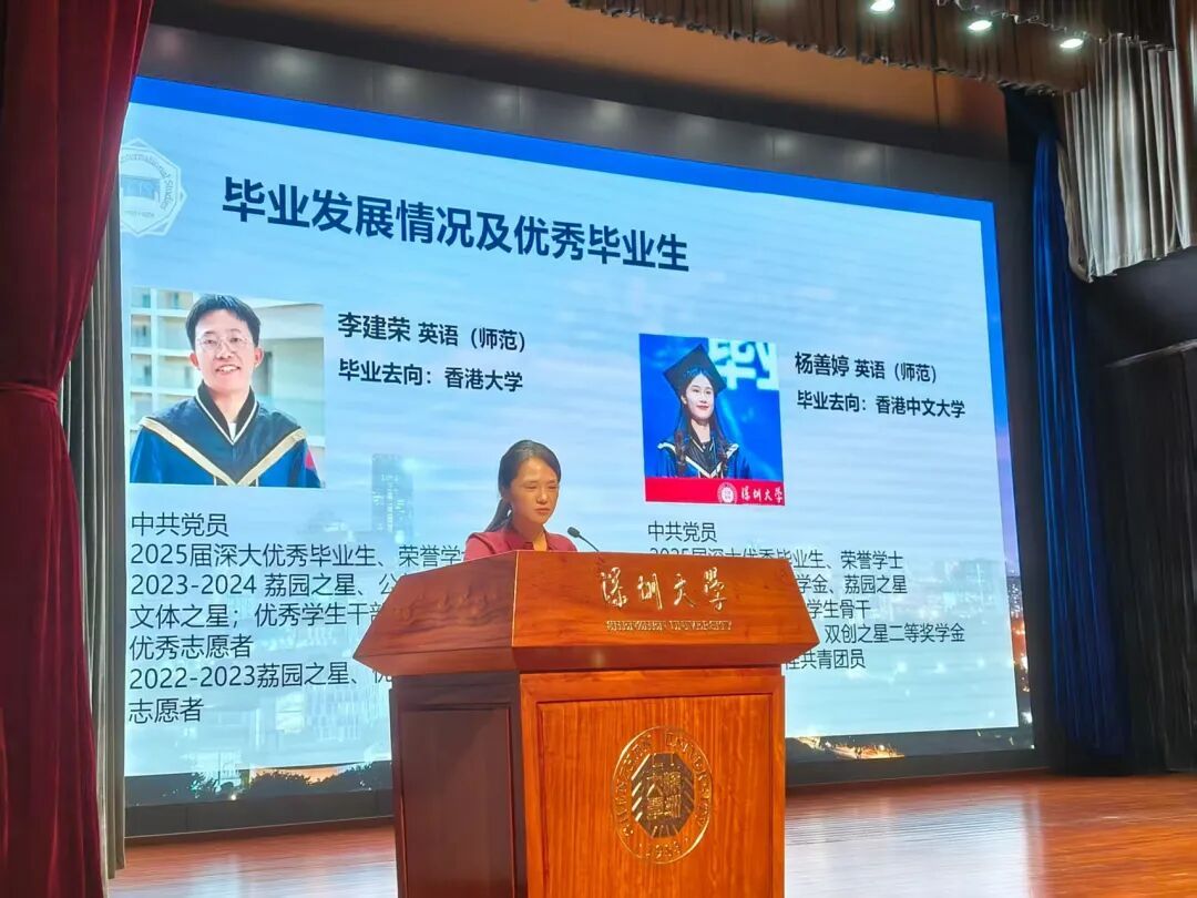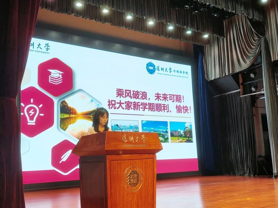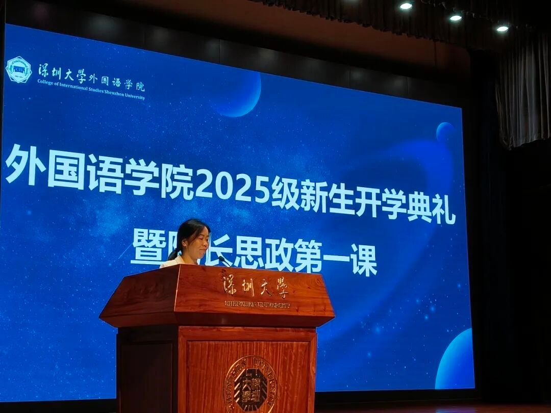 金秋九月,鹏城焕新。2025年9月5日,深圳大学外国语学院2025级新生开学典礼在庄严的国歌声中拉开帷幕。外国语学院邱江平书记、戴永红院长、胡亦杰副院长、贾陆依副院长、金娜娜副院长、张丹阳副院长,英语系陆烁系主任、日语系连兴槟系主任、西语系赵燕系主任、2025级新生班主任,学院办公室、外语教学实验中心和学院学工办的老师以及全体2025级新生出席了典礼,典礼由外国语学院李慧敏副书记主持。
