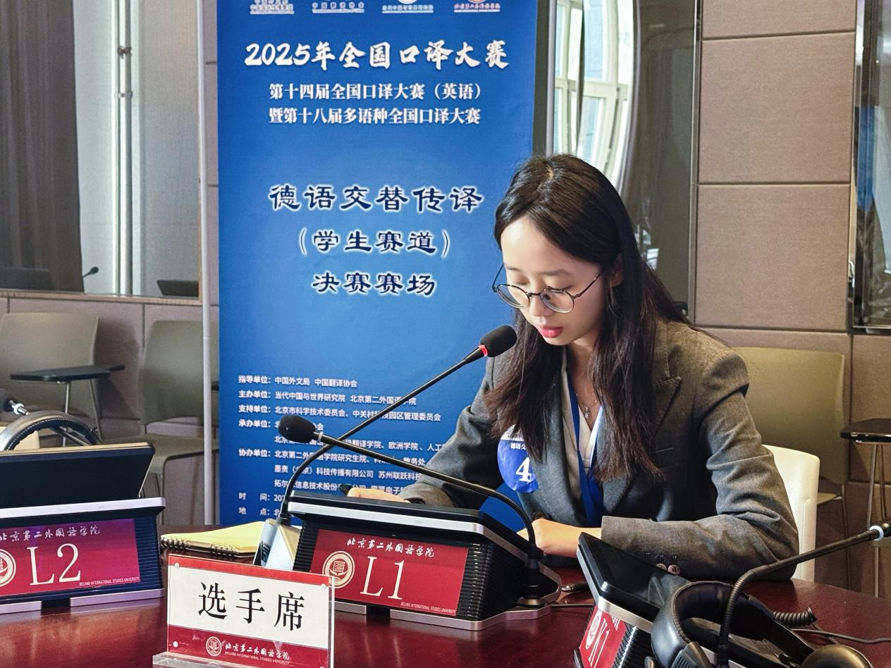 22级德语专业黎芷琳同学在德语交替传译赛道中表现突出,成功跻身全国前十,获得全国总决赛入场券。她沉着应战、发挥稳健,最终荣获德语交替传译全国三等奖,实现了我院德语专业在该项赛事中的新突破,也彰显了学院多语种人才培养上的显著成就。