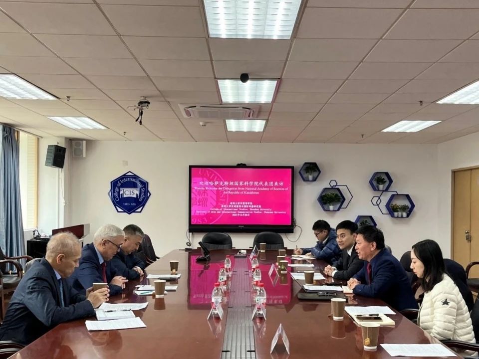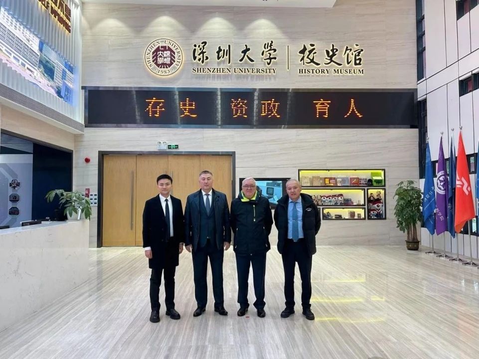 2023年12月22日,哈萨克斯坦国家科学院代表团一行来访深圳大学,同外国语学院、区域国别与国际传播研究院师生开展了热烈且富有成果的学术交流。参加此次会议的哈方代表团有国家科学院第一副院长兼哲学、政治学与宗教学研究所所长谢伊杜马诺夫院士(S. Seidumanov)、哲学、政治学与宗教学研究所副所长内桑别克(U. Nyssanbek)研究员及该所政治研究中心主任阿姆列巴耶夫(A. Amrebayev)研究员。外国语学院院长、区域国别与国际传播研究院院长戴永红教授,社科部副主任、外国语学院院长助理翁冰莹教授,外国语学院院长助理、区域国别与国际传播研究院副院长黄乐平副教授,区域国别与国际传播研究院副院长孙晓奇博士,俄罗斯中亚研究中心主任李竟成博士等师生代表参加了此次活动。此次座谈会以“加强高校与科学院国际联系,推动人文社科联合项目发展”为主题。会前,代表团一行首先来到深圳大学校史馆参观,深入了解深圳大学自1983年建校以来的办学历程,对深圳大学在40年取得的发展成就表示高度赞赏。