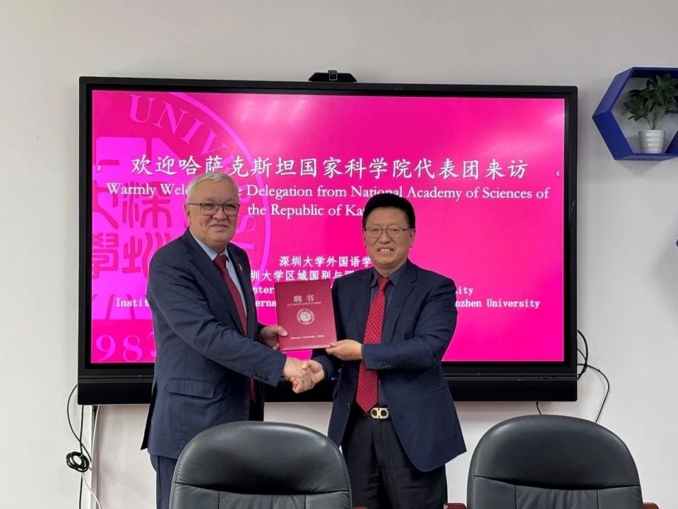 外国语学院、区域国别与国际传播研究院与哈萨克斯坦国家科学院举行学术座谈会会后,戴永红院长向谢伊杜马诺夫院士颁发了深圳大学外国语学院客座教授聘书,双方均表示愿进一步推动哈萨克斯坦国家科学院同深圳大学的国际科研与教育合作,为中哈友好关系发展注入新动力。