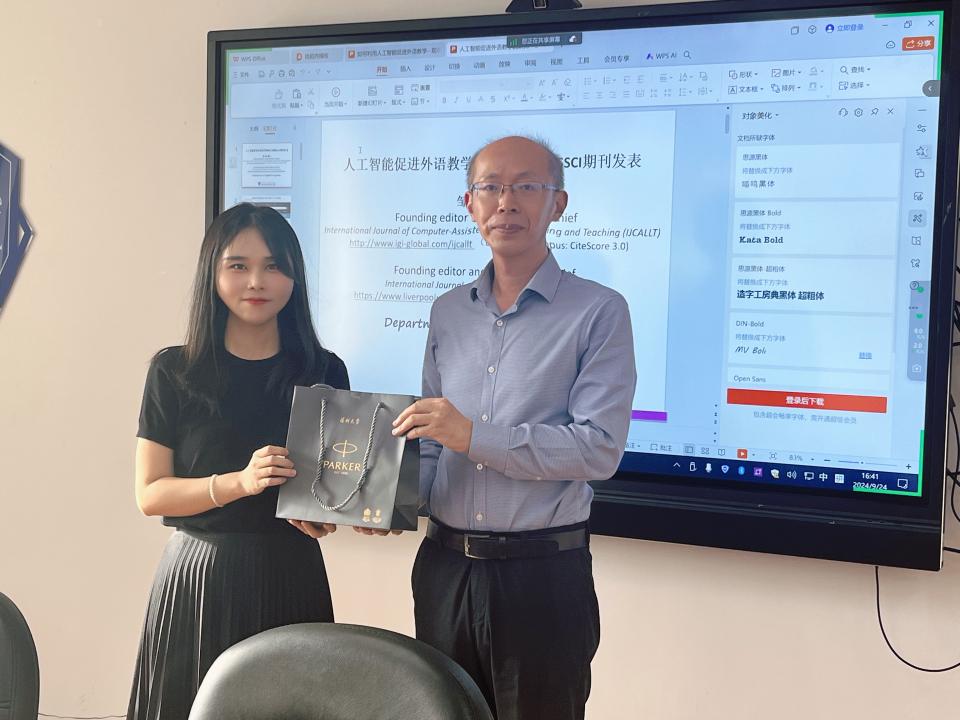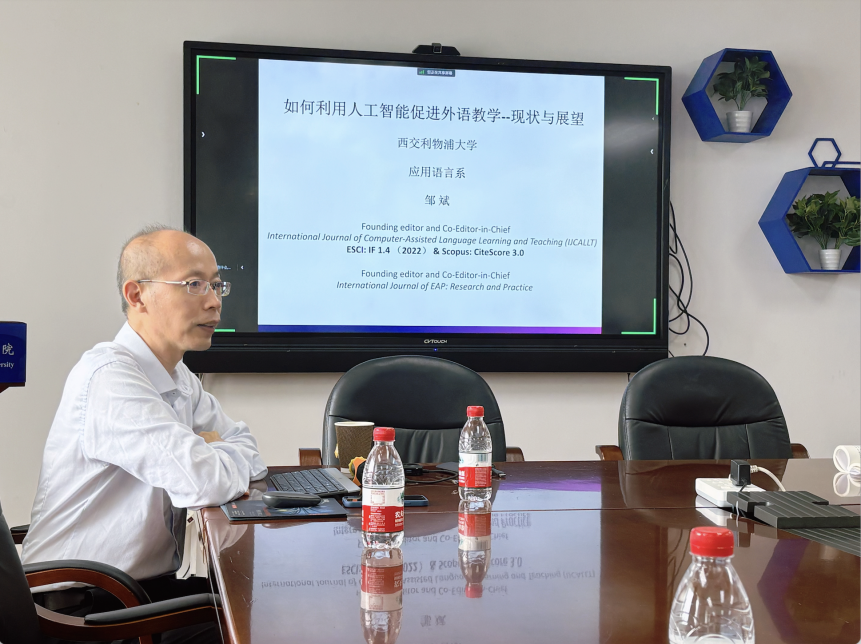 2024年9月24日下午,邹斌老师为我们带来了“人工智能促进外语教学的研究与国际SSCI期刊的发表”的主题讲座,讲座通过对近期生成式人工智能技术所带来的研究热点问题进行深入分析,探讨如何利用人工智能技术促进外语教学的研究,以及如何更好地在SSCI期刊发表文章。