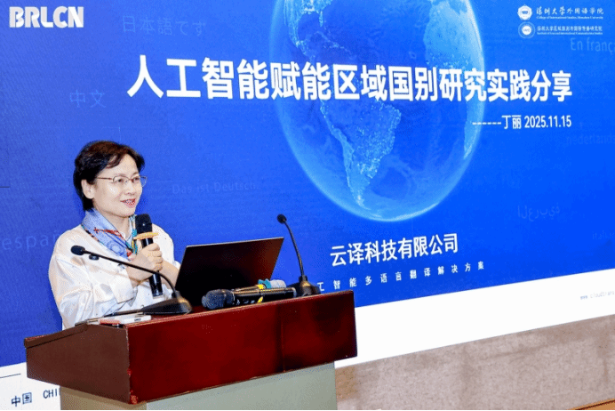 云译科技有限公司丁丽董事长以“人工智能赋能区域国别研究实践”为主题展开分享。她介绍,云译科技作为专注于AI与自然语言处理的多语言解决方案供应商,自2016年成立以来,已积累40亿句对行业数据,掌握语音识别、机器翻译等自研核心技术。其核心产品“区域与国别研究智能信息系统”可实现全球百种语言舆情自动采集、中文跨语检索、AI智能问答,还能基于DeepResearch与RAG技术生成高可信度深度报告,已服务深圳大学、上海财经大学等高校及军工领域。此外,系统配套数据统计、人工审校功能,为区域国别研究与国际传播提供高效、精准的技术支撑。