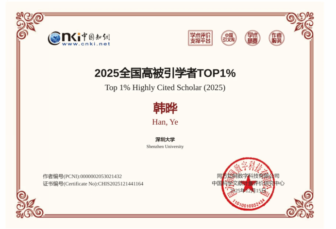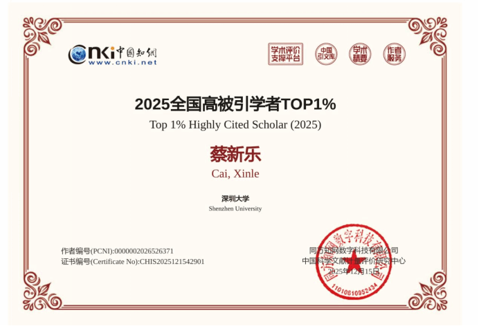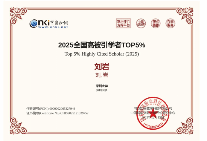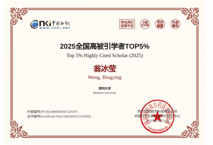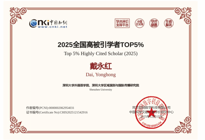 此次遴选遵循“聚焦高影响力成果”及“贡献度量化”原则,基于2015-2024年中国知网收录的期刊会议论文,以作者总PCSI(论文引证标准化指数加权求和)为核心指标,全国约12万人入选,其中Top1%学者约3万人、Top5%学者约9万人。深圳大学外国语学院7位教授的入选,不仅是个人学术成就的体现,更反映出学院在师资队伍建设、学科建设等方面的突出成效,为推动学科发展与学术交流贡献了重要力量。未来,学院将继续支持学者深耕前沿领域,推动学术成果转化,为粤港澳大湾区及国家战略需求贡献智慧。