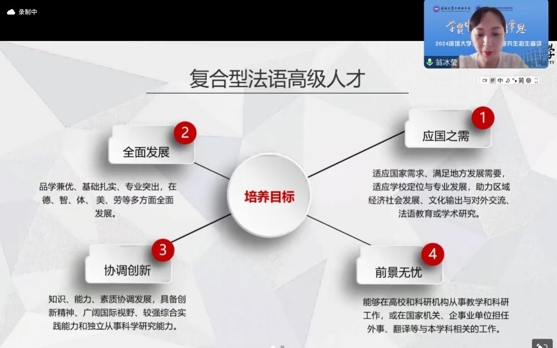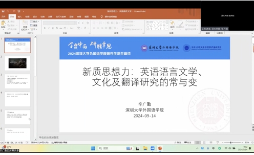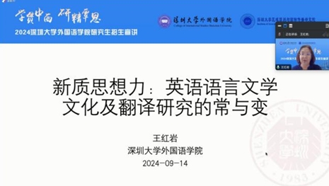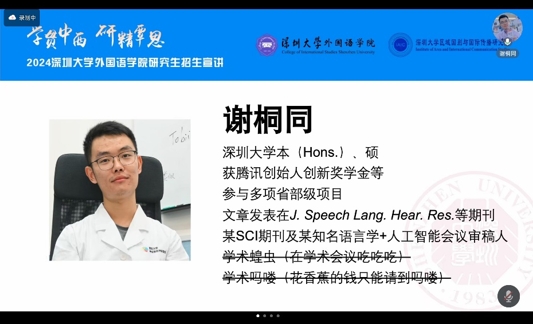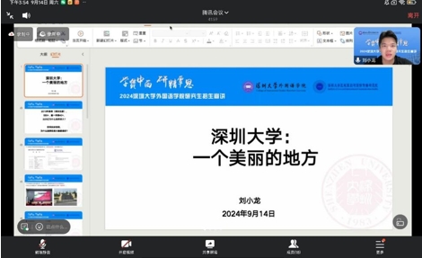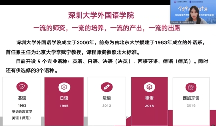 2024年9月14日,深圳大学外国语学院举办了2024年深圳大学外国语学院研究生线上招生宣讲活动。宣讲活动由张丹阳副院长主持,吸引了国内各高校50余位优秀学子在线参与。