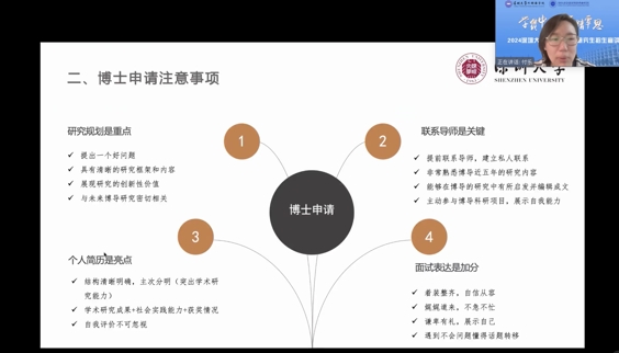 深圳大学外国语学院主席团成员刘小龙同学从科研学习、学生工作、社会实践、实习兼职、项目申请和论文写作等方面分享了自己的心得与体会,他鼓励各位同学养成阅读文献和记录文献的习惯,加强与导师的联系,提高学习效率,逐步提高学术和科研的意识和素养,同时积极参与社会实践以提高自身的综合素养。刘小龙同学的分享为考生们展示了其全面发展、全面成长之路,为考生树立了榜样。