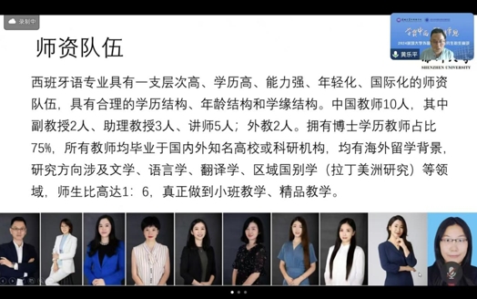 西班牙语语言文学方向由深圳大学外国语学院院长助理、区域国别与国际传播研究院黄乐平副教授进行介绍。黄院长首先介绍了西班牙语语言文学硕士点的历史背景以及发展情况,指出西语硕士点拥有优秀的师资团队和特色的课程。黄院长指出,西语语言文学硕士点在传统教学的基础上,对课程进行改良,以培养符合国家需求的复合型人才为目标,开设了语言技能、文学文化、国别区域等各个方向的课程。黄院长向考生展示了西语学生专四专八的考试中取得的优异成绩,和全国高级别大赛中所获的奖项。除此之外,西语硕士点还设立了深圳市首个拉美研究中心,致力于培养“外语+”的跨学科人才。此外,西语硕士点还主办了大湾区杯”全国高校外语专业区域国别学知识能力竞赛,旨在培养具有国际宏观视野、学科交叉意识、解决实际问题能力的国际复合型人才。
