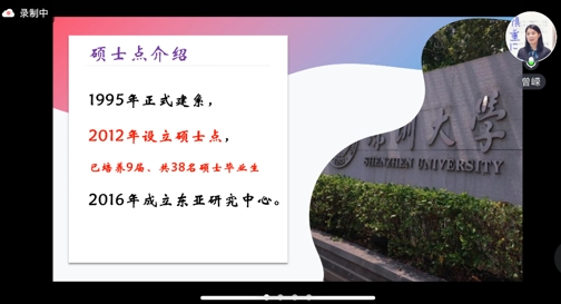 日语系副主任曾嵘副教授对日语语言文学硕士点进行了介绍。曾老师首先介绍了深圳大学日语系的历史背景和发展情况,通过介绍强大的师资力量和学术资源及优秀的培养质量说明深圳大学日语语言文学学科点的优势。接着,曾老师逐一介绍了日语语言文学的特色课程,如《女性文学研究》、《中日文学文化比较研究》、《日本思想史研究》、《日本语语用论》和《日语教育学》等。国际化方面,深圳大学日语语言文学拥有丰富的海外留学项目,可以支持同学们前往日本著名大学进修,获得与日本顶尖学者交流的机会。谈及就业情况,曾老师展示了9届硕士毕业生的就业情况和成就,充分说明了深圳大学日语学子强大的就业竞争力。最后,曾老师介绍了2025年日语系的招生人数和选拔方式,并鼓励对日语研究和学习有热情和梦想的优秀学子选择深圳大学日语语言文学硕士点。