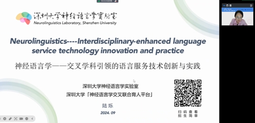 英语系主任、神经语言学交叉平台负责人陆烁教授介绍了神经语言学交叉平台的概况与发展历程。首先,陆教授指出神经语言学专注应用领域、培养创新型人才的特点,简要介绍了2025年硕士招生概况,并重点讲解了该学科方向强大的跨学科导师队伍。随后,陆教授讲解了神经语言学定义,聚焦失语症、儿童语言、双语习得、脑机接口等主要议题,指出神经语言学的现代研究方向已逐渐转向语言康复和辅助疾病诊断。陆教授指出,神经语言学交叉平台以语言服务产业新拓展为指引设定人才培养目标。最后,陆教授以图片和案例向同学们生动展示了神经语言学团队的教学与科研日常,诚邀对神经语言学有兴趣的同学加入其中,一同探索未知。