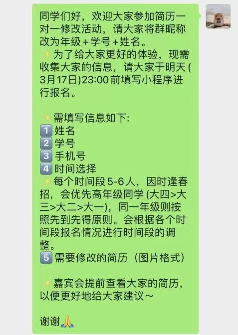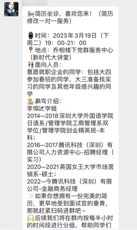 活动开始前,通过在班长群、毕业生大群发布通知等途径对活动进行宣传,并组建简历修改群。后续,在简历修改群发布信息,提前收集同学们的简历,以便简历修改者提前准备,在现场给予更佳指导。为了使简历指导更具有针对性,特邀请了深圳大学外国语学院毕业的校友作为简历修改老师。同时为了使同学们减少等待时间,获得更好的体验,在活动开始前按每半小时为一个时间段对同学们进行了分组。