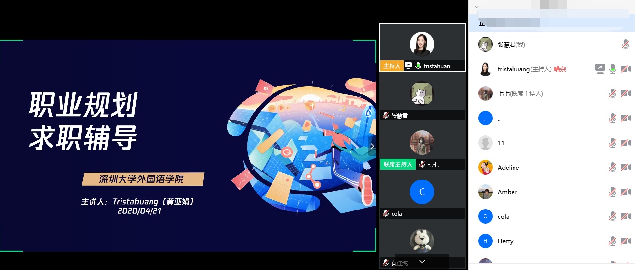 2020年4月24日下午15:00,深圳大学外国语学院主办了题为“笔试及面试技巧辅导”的线上讲座。本次邀请的主讲嘉宾黄亚娟校友,2010年起就职于深圳市腾讯计算机系统有限公司,现担任腾讯公司高管秘书,香港理工大学硕士在读,曾多次作为面试官参与腾讯校园招聘工作,具有丰富的校园招聘和面试相关经验。