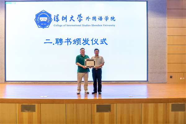 讲座开始前,外国语学院院长戴永红教授为王铁成先生颁发客座教授聘书。