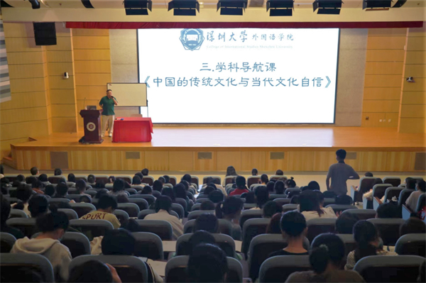 10月24日,深圳大学外国语学院外语学科导航第三讲在汇星楼开讲,由外国语学院客座教授、九杉科技集团公司董事长王铁成先生主讲,题目为:中国的传统文化与当代文化自信。