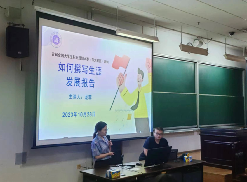 首届全国大学生职业规划大赛深圳大学赛区将于2023年10月至11月举办,为了帮助参赛选手更好理解赛项要求,积极备赛,2023年11月1日,在汇文楼H4 101开展了以《如何撰写生涯报告》为主题的培训会。主讲人系深圳大学学生就业指导中心老师、GCDF&BCF职业生涯规划师、高校初级心理咨询师、腾讯益友奖“优秀辅导员”龙菲老师,外国语学院党委副书记李慧敏等出席本次讲座。