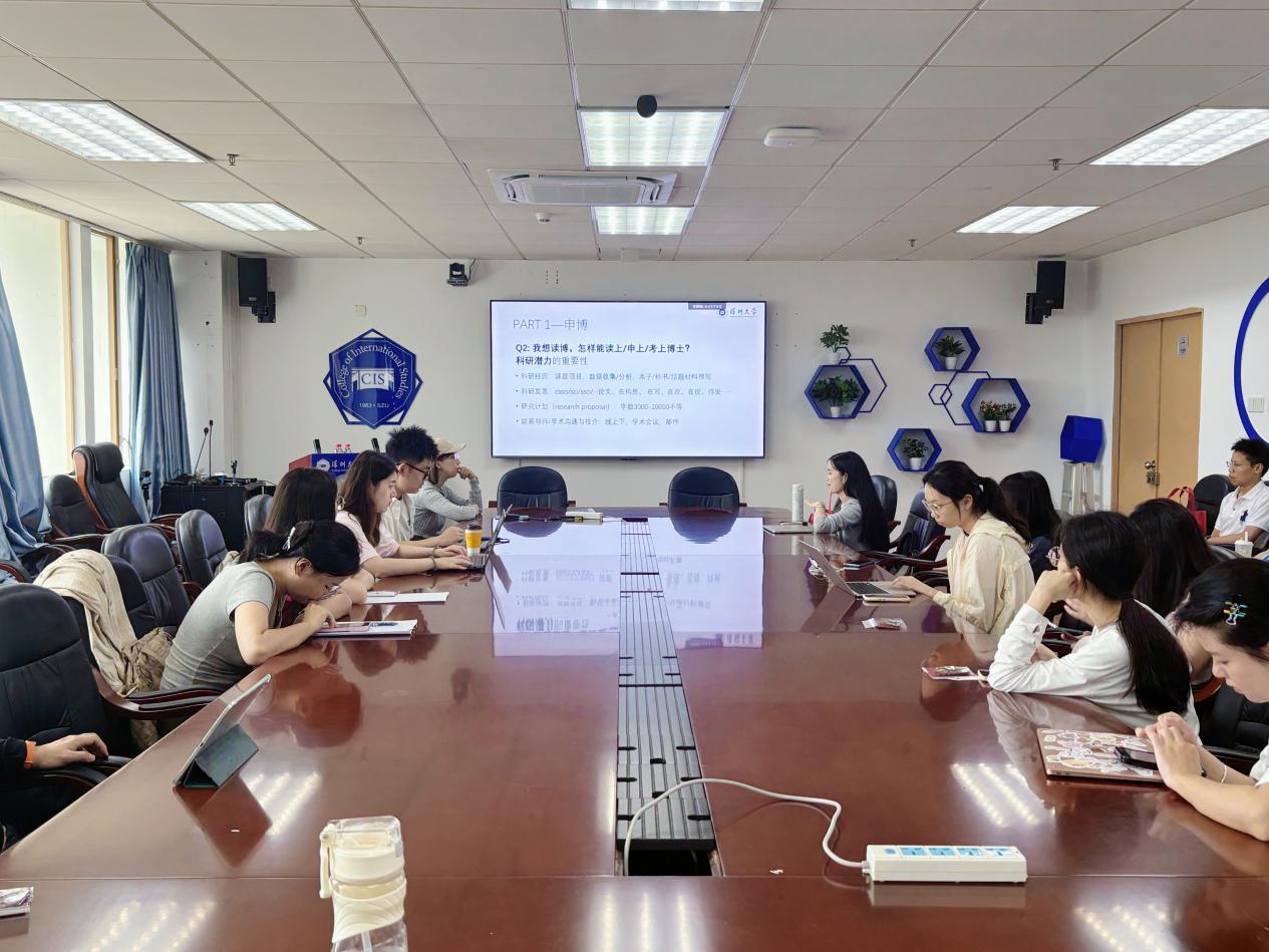 第一位分享者谢桐同学长结合自身经历,分享了自己的申博经验。他详细列举了申博所需材料,包括语言类证书、已发表的学术论文等,并指出这些材料不仅是申请的“敲门砖”,更是导师评估申请者学术能力的重要依据。接着,谢学长分享了他在学术积累方面的经验。他建议大家积极参加各类学术会议,通过与同行的交流和学习,拓宽视野,培养敏锐的学术思维。在介绍申博流程时,他还提醒大家注意材料寄出的截止时间,避免因时间问题错失机会。最后,谢学长向同学们提出了宝贵建议:如果有申博意向,应尽早确定目标学校和意向导师,并尽快着手完成并反复打磨研究计划,以确保在申请时能以最佳状态呈现自己的学术实力。