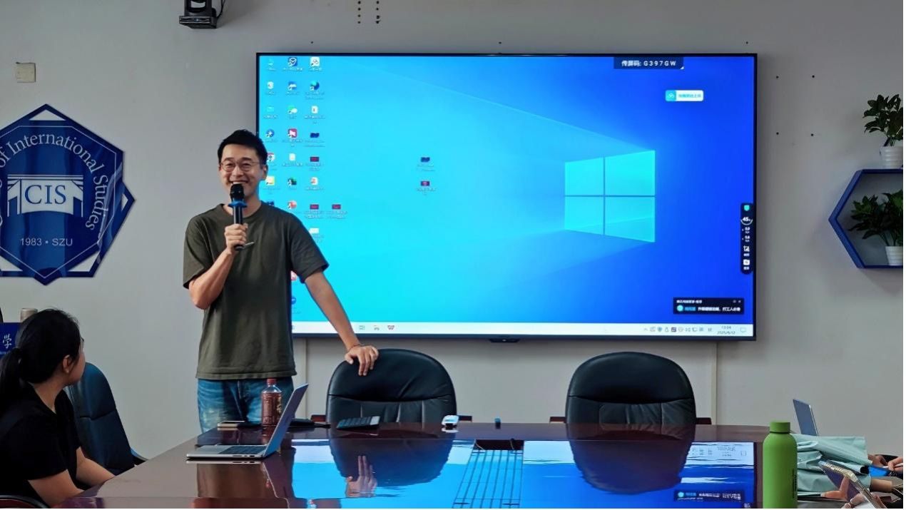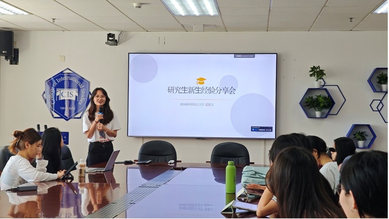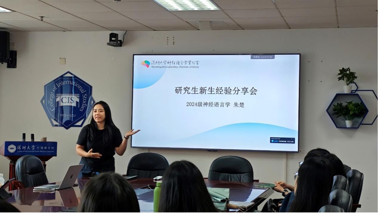 2025年9月12日中午,深圳大学外国语学院研会举办了新老学生交流会,分别邀请了口译专业的吴子硕同学、外国语言文学的温蓝玉同学和神经语言学的朱楚同学为大家分享研究生期间学习、科研及生活方面的经验,并与在场学生进行互动交流。