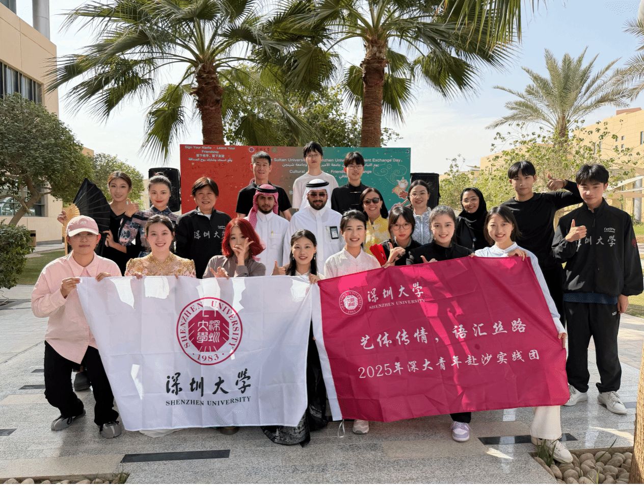 11月15—20日,深圳大学—苏尔坦亲王大学“体艺融合·文明互鉴”青年文化交流活动在沙特首都利雅得举行。外国语学院2025级外国语言文学专业(国别区域与中国海外利益保护研究方向)博士研究生张琳、2024级翻译硕士(MTI口译方向)研究生李欣宇随团承担学术发言、实时口译及新闻宣传任务,六天行程密集完成各项支持工作,获主办方及校方一致肯定。