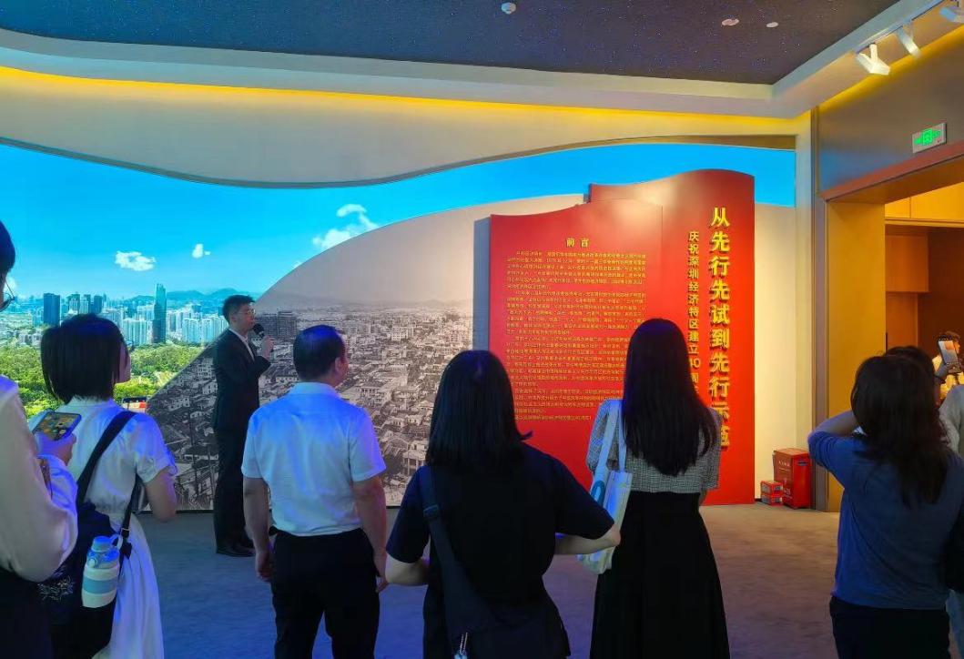 “砥砺前行四十载”板块以生动的照片和纪实的影像展现了深圳经济特区40年风华背后的历史复杂性和发展历程。通过讲解员的细致解说,同志们切实体会到历史建设者的辛勤与不易,感受到改革开放事业的“苦尽甘来”。“阔步迈进新时代”板块展示了在党中央坚强领导下,深圳攻克难关,深化改革事业的新成就。“扬帆启航大湾区”板块聚焦粤港澳大湾区建设、深港澳合作、域协调发展等内容,展示了深圳坚决贯彻执行党中央决策部署,不负使命推进大湾区建设的显著成果。“先行示范再出发”板块围绕党中央对深圳先行示范区的战略定位和工作部署,展示了深圳从先行先试到先行示范的可喜成果,展现了深圳敢闯敢试、敢为人先、埋头苦干的特区精神。